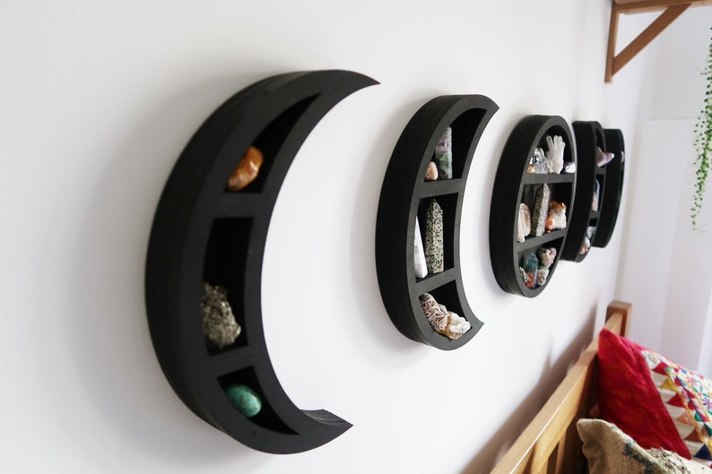 Wooden crescent moon shelf, great for displaying decor pieces, crystals and essential oils.